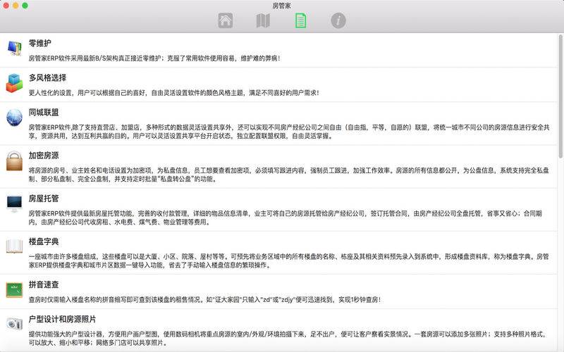 房管家ERP房产中介管理软件MAC版, 专业的MAC版房产中介管理软件,专业房产经纪人办公平台。 功能全面:房管家ERP房产中介管理软件从基本的房客源管理、查询,到管理层决策重要工具统计分析查询等等。 移动办公:凡房管家ERP房产中介管理软件用户随时随地通过手机打开房管家,即可与PC版本信息实时同步,电脑中录入了信息,手机版本立即同步显示,用户随时随地都可以快速、准确的查找到所需要的房源信息大大提高房产中介工作效率,从而提高中介公司的业绩水平。