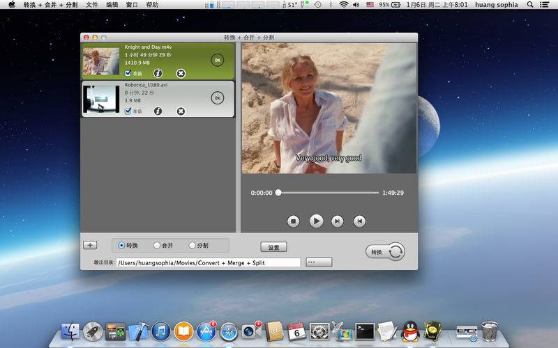 转换 + 合并 + 分割支持成百的批处理转换媒体文件。你直接能拖拽目录和文件到窗口列表中,转换前可预览媒体信息。你可以自由选择要保存的目录,转换完成后可自动跳到该目录。