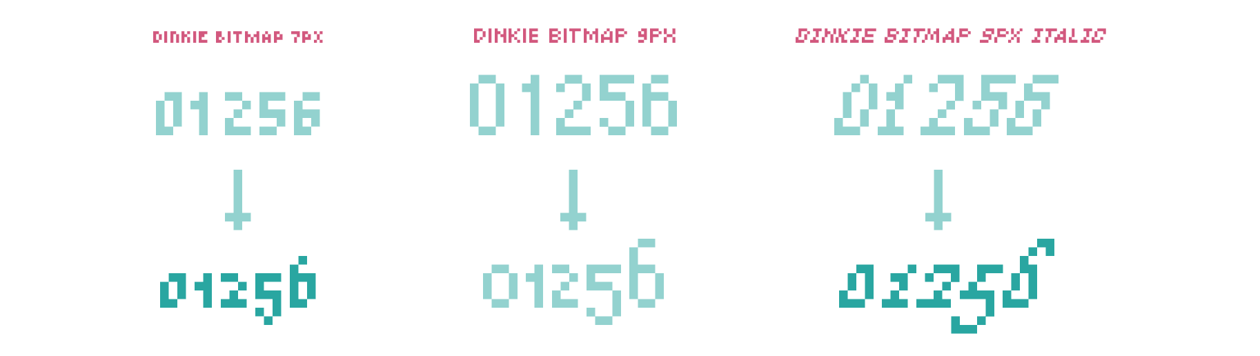 其中 7px 的大写字母是可保持清晰的最小拉丁字母尺寸——大写 5px 高;小写字母则在极限的 4 像素 x 高度(字母 n、x、 v 等所占的纵向空间)中完成。在此基础上,甚至制作了仅 4 像素高的小型大写字母!