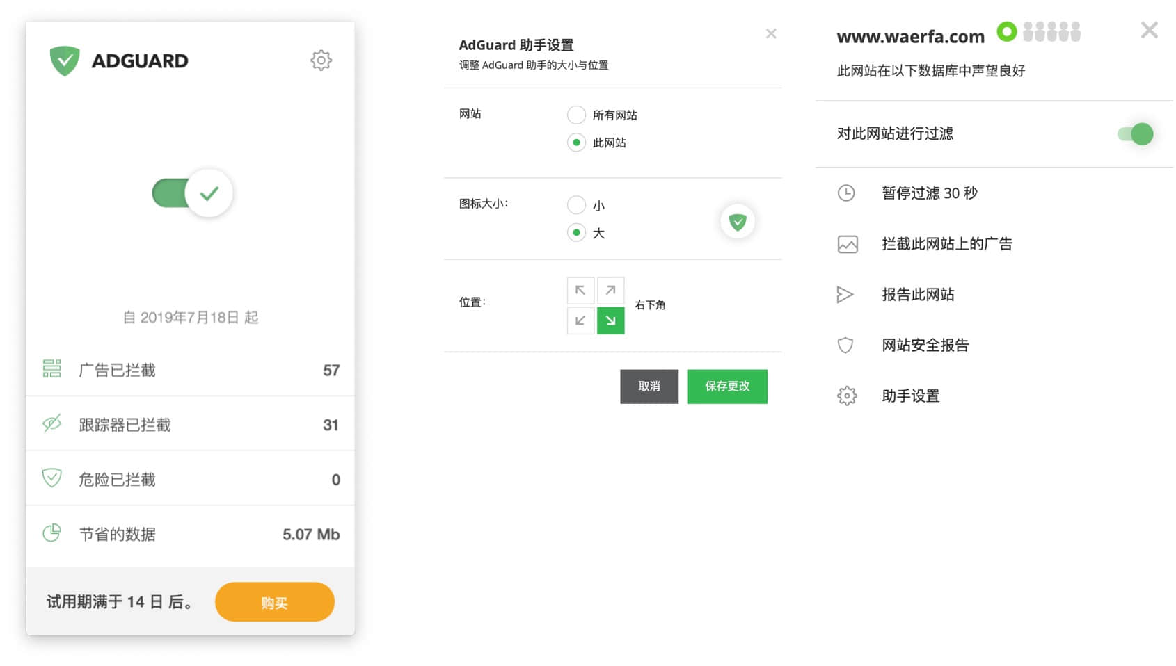 软件启动后会有一个非常详尽的引导设置程序,你可以选择内容拦截(网页里的社交 button、widget,订阅 button、弹窗程序)、广告拦截(具备强大的过滤器)、隐私保护等级(分三个级别)以及提供的 Adguard 助手(网页隐藏飘窗)。