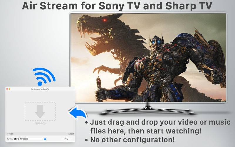 Air Stream works with any UPnP/DLNA-enabled Sony/Sharp TVs or devices such as Bravia TV, Sony/Sharp Blu-ray players, and PlayStation. Actually, most new Sony/Sharp TVs or devices support UPnP/DLNA technology. This app can stream your favorite media to the TV via your home network. Just drag and drop your media file to Air Stream, and it will appear instantly on your TV Screen! No hassles!