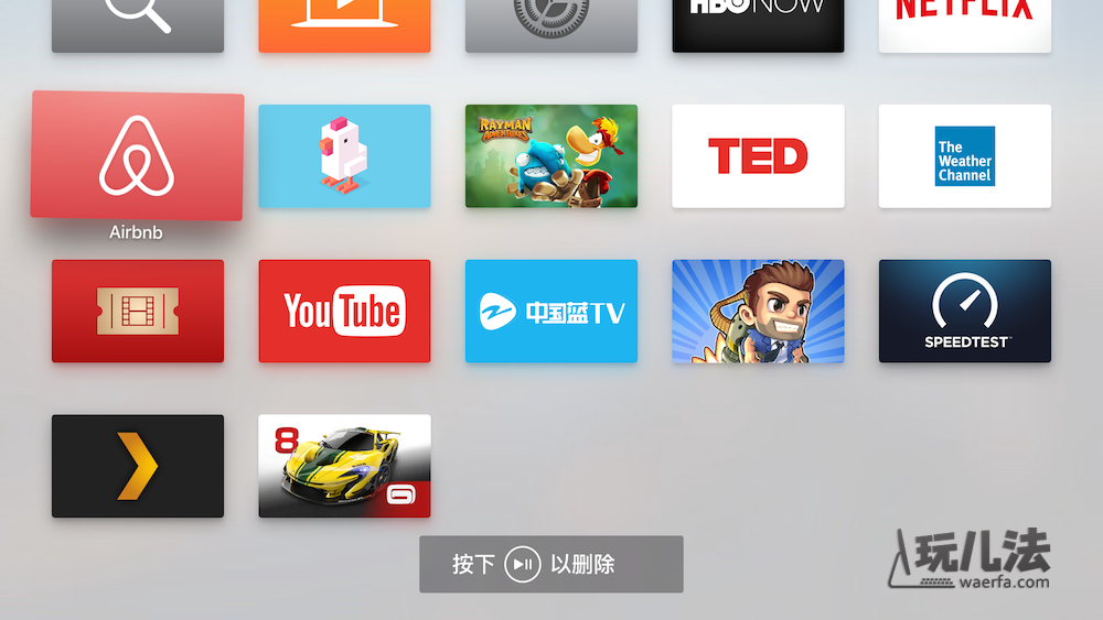 同样,滑动到需要删除的应用图标处,长按触控板,点击遥控器上的播放/暂停按钮进行删除。