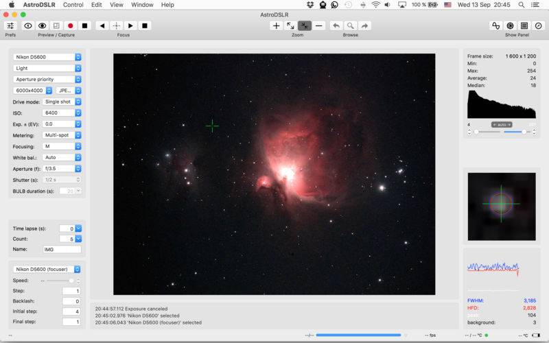 AstroDSLR controls ISO, aperture (if lens mounted), shutter speed, exposure compensation, metering and focusing modes, white balance, image quality and format and BULB exposure length. It can preview (optionally using LiveView) or capture and save images to selected folder with any file name prefix, count and time lapse, browse captured images and show them in Finder, zoom and stretch them automatically or manually. It can measure FWHM and the drift of a selected star to help easier and faster focus and align your equatorial telescope mount. Captured images can be plate-solved using public astrometry.net service or local Astrometry for OS X application.