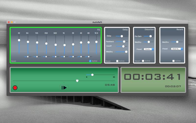 As well as the equalizer you can adjust the sound for other functions, such as delay, distortion and reverb. Chain them together with or without the equalizer to exploit the full power of AudioRefit, or use them individually. AudioRefit works with numerous audio formats.