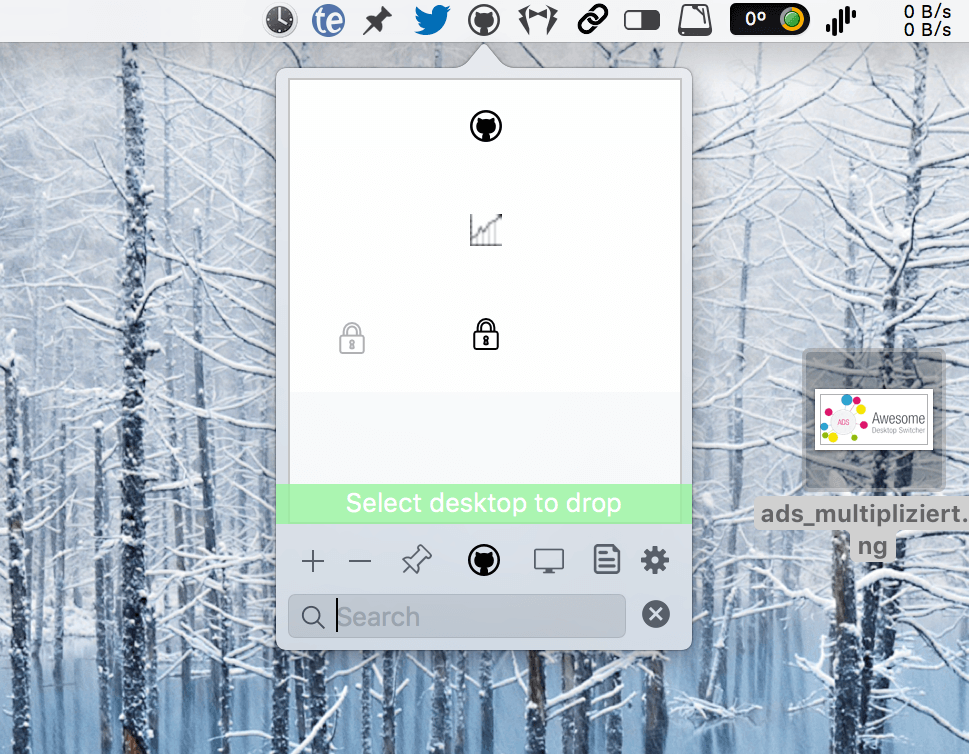 移动文件(目录)的设计可以向 Dropzone 借鉴,当前软件中必须需要你将目标拖入 ADS 的 Menubar 图标上,然后选择目标桌面(单击)才能完成移动,如果能做成完全拖拽式会更便捷。轻轻的将 Github Repo 拖入搜索栏可以自动新建一个桌面,并以 Repo 文件名保存文件到当前桌面。