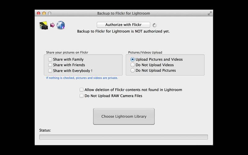 Backup to Flickr for Adobe Lightroom takes your pictures and/or videos and backs them up to Flickr, keeping your structure intact. Start saving in 10 seconds! 1. Authorize your Flickr account 2. Point to your Lightroom Library 3. Start the transfer