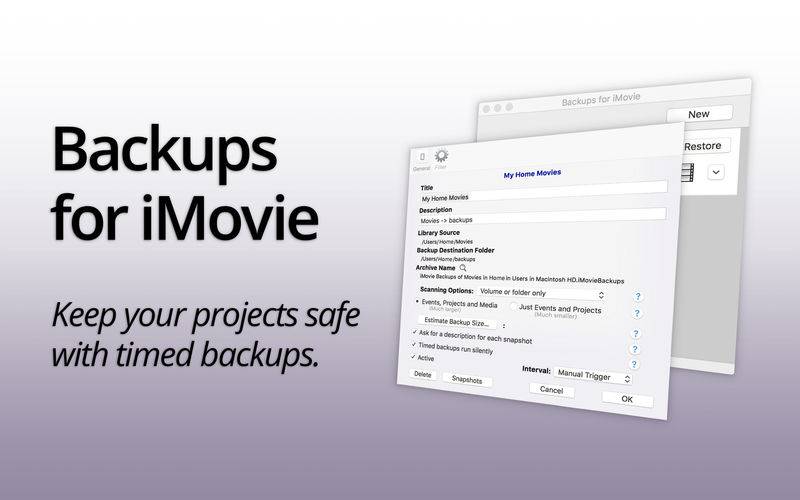 Based on the 5 star rated Backups for Final Cut Pro, Backups for iMovie is like Time Machine® for iMovie®! It performs timed and manual snapshots of your iMovie Libraries.