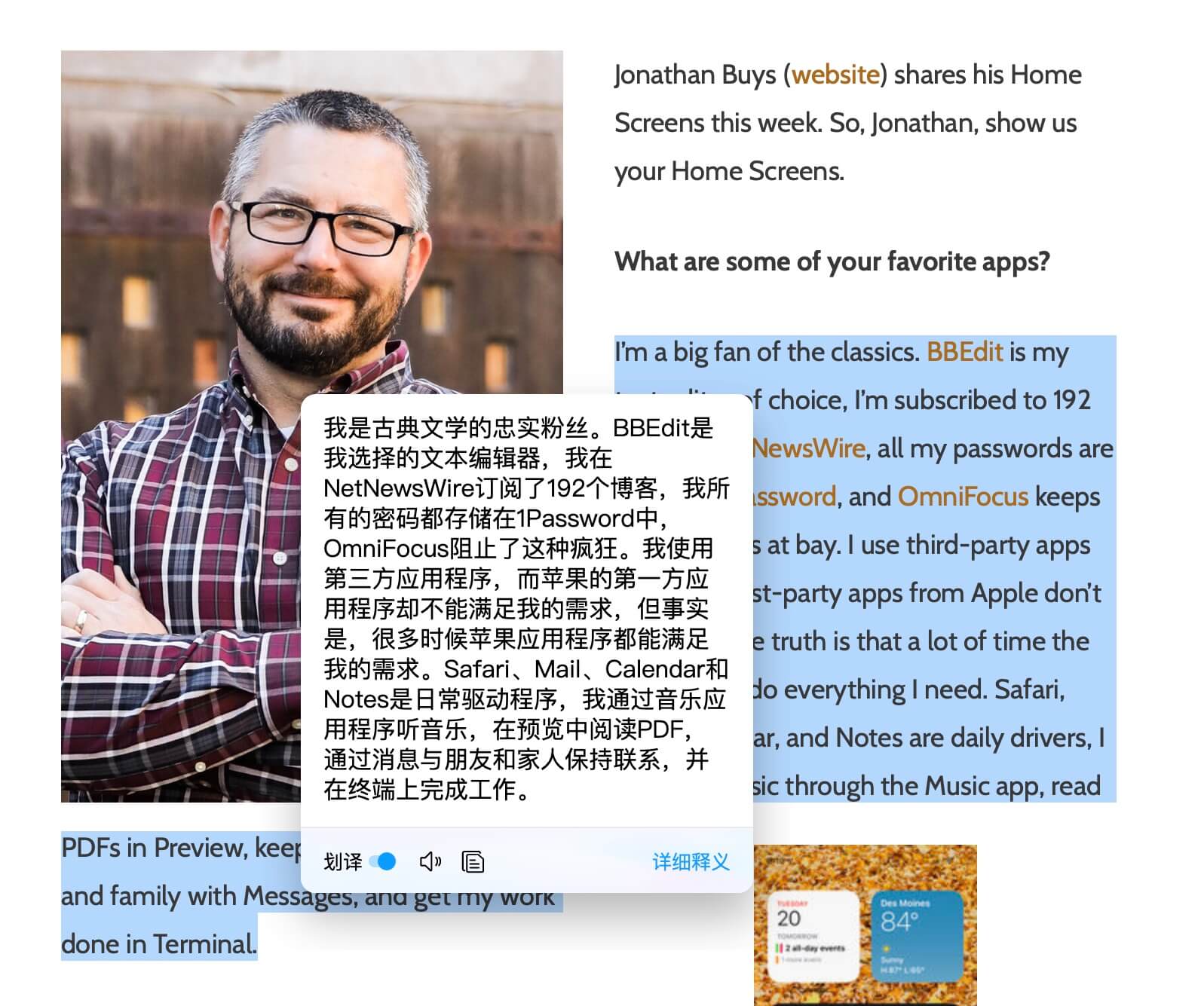 选择好段落后,划词翻译自动触发翻译结果,这个时间可以算是秒开的水平了,真的是非常快了。点击“详细释义”可以跳转到独立窗口进行浏览。