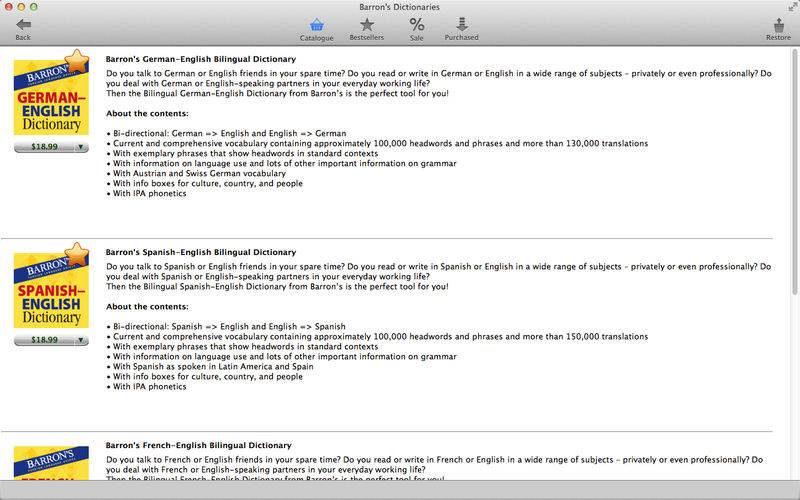 Now you can make sure that a dictionary complies with your language level and contains all words you need before purchase. Full-fledged versions are available for buying with the in-app dictionary catalog.
