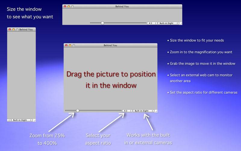 Want to see who is coming up behind you? Have a web cam and need to monitor an area you can't quite see from your desk? Behind You is the app for you.