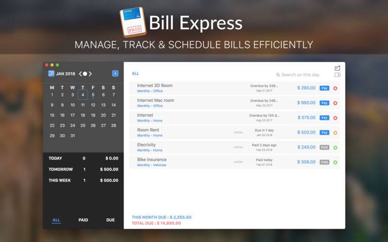 Bill Express is a simple tool to schedule and track different types of bills that you pay for a month. With this app you can generate lists of overdue payments, planned payments and check what has already been paid off. Bill Express is made to help with those needs! Make your ongoing monthly financial planning an easy and pleasant task!