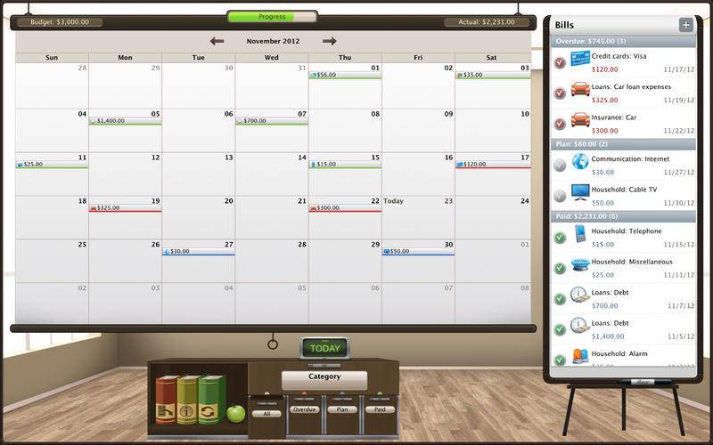 Bills is an application that can help you plan and track your expenses every month. Brilliant interface will remind you of a real-life office room (check the screenshots). Clear, simple and quick (a MUST HAVE) financial planning! You always need a simple tool to control how much you want to spend this month. Essentially you need a big calendar to track how much money you have spent compared to how much you wanted to spend. You also need to generate lists of overdue payments, planned payments and check what has already been paid off. Bills for Mac are made to help those needs! Make your ongoing monthly financial planning an easy and pleasant task! The way you work with the application: Set a figure indicating how much you want to spend this month. Mark days on the big calendar when you need to pay for anything or buy anything. Then when you actually have a transaction, approve it quickly (you may also approve it partially and reschedule the rest of the payment). Easily filter your bills and payments via the calendar and special boxes to show your planned, overdue and paid expenses & bills. If you spend too much, the green bar above the calendar will help you to understand it. Extra feature: export to CSV (Excel)! Design: each element reminds of real office room objects, which are so familiar to all of us and help to concentrate when taking care of the bills and expenses. Flip board shows the list of your transactions. Big projector screen shows you a calendar view of the current month. Office folders are reserved for extra features. Drawers are meant to serve as filters. And when you add or edit entries, you will see a memo book page. Summary: great interface design (real office room) easy management of expenses and bills quickest work with entries filters for paid, planned and overdue payments easy export to CSV (Excel)
