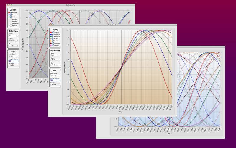 • Plotting of the three primary and four secondary biorhythm cycles. You choose which of the seven cycles you want to see plotted.