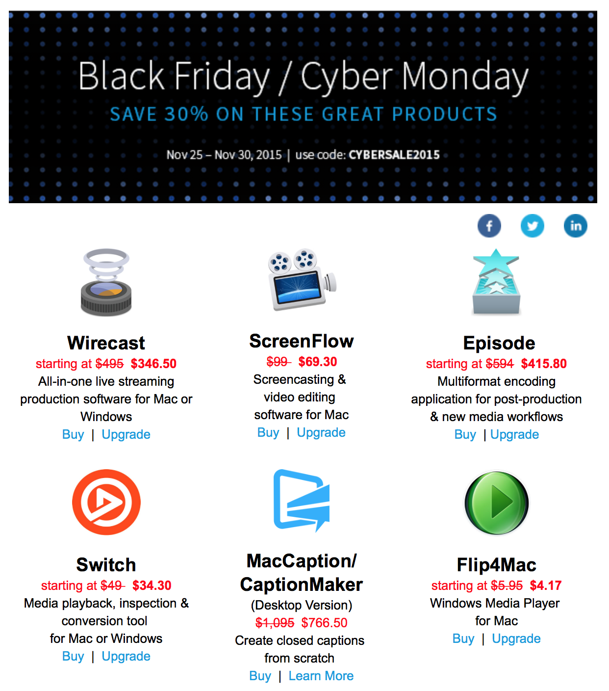 著名的外语学习工具 Rosetta 黑五套餐出来了,套餐分 CD-ROM、Download 以及在线学习三种形式,价格均为 199 刀,可分期付款,每期仅为 40 刀,2 年有效期,购买戳。Telestream 全线软件产品 7 折