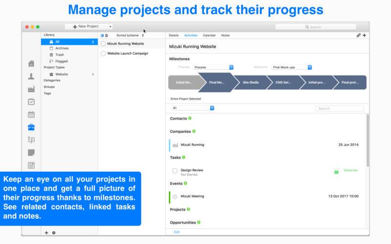 • Manage projects and track their progress - track progress using milestones and the calendar, see what tasks still need to be done and see related contacts, linked notes and documents.