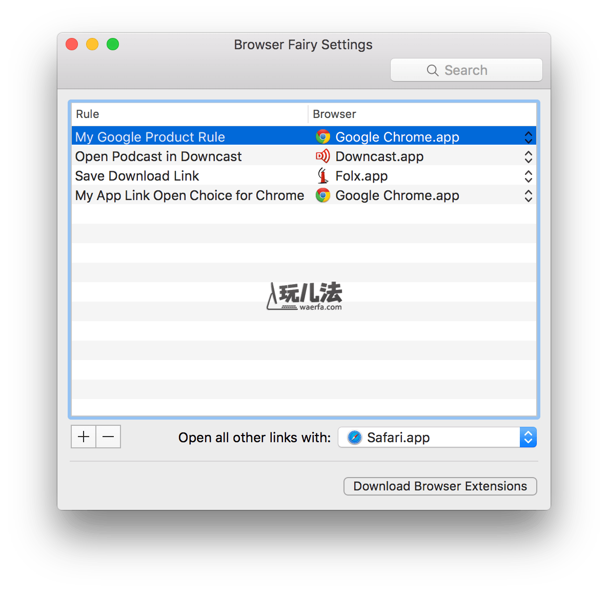 Browser Fairy 可以在后台设置两种 Rule,一个是根据网站网址指定不同的浏览器,比如凡是包含 google.com 的网址都会自动调用 Chrome.app 打开;另一个是根据软件指定浏览器,比如像凡是 Mail.app 里包含的链接都自动调用 Chrome.app 打开。