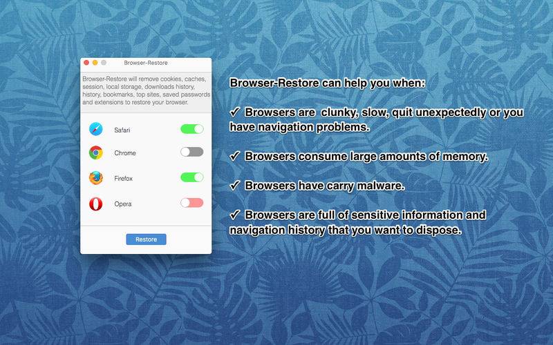 Browser-Restore will remove cookies, caches, session, local storage, downloads history, history, bookmarks, top sites, saved passwords and extensions to restore your browser.