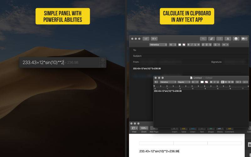 Calcularium Context is a simple and powerful calculator, that will gracefully handle all your everyday calculation needs. It's retina ready, it can be moved around your desktop and resized, it has a global shortcut to activate the app.