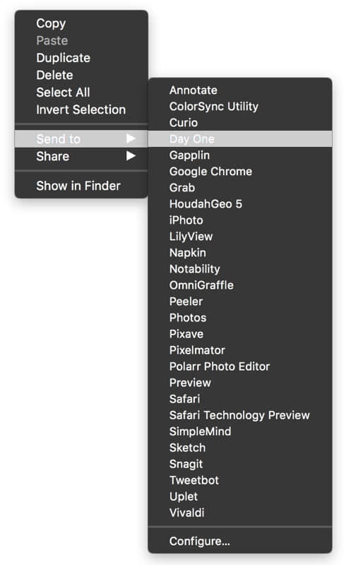 另外资料库里的视频和图片可通过右键菜单中的 “Send to” 将其发送到其他应用程序进行编辑 或管理,比如像“Annotate”、“Curio”、“Gapplin”、“HoudahGeo 5”、“LilyView”、“Pixave”、“Pixelmator”、“Sketch”、“Uplet”、“Snagit”、“Napkin”、“泼辣修图”、“Notability”等都在支持列表中。