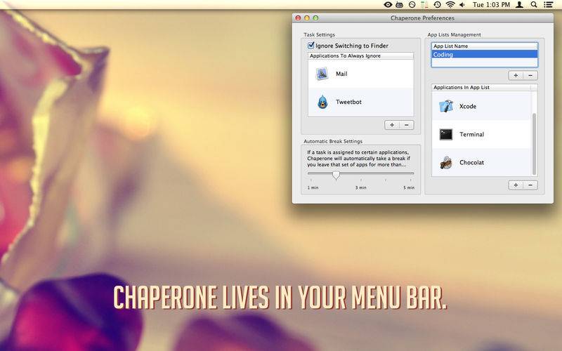* Assign applications to tasks and have Chaperone remind you to stay on task if you leave the applications.