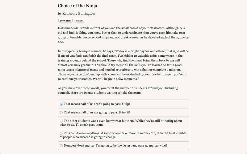 Choice of the Ninja is an epic interactive fantasy novel by Katherine Buffington, where your choices determine how the story proceeds. The game is entirely text-based--without graphics or sound effects--but driven by the vast, unstoppable power of your imagination.