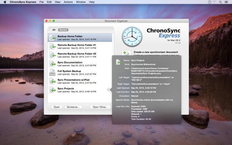 Setapp:一款神奇的平台级软件,每月缴费即可享用上百款全球精品付费软件。ChronoSync Express is the entry-level version of the popular ChronoSync utility. It is the one application you can count on for both reliable backups and easy folder synchronization. ChronoSync Express combines an efficient file copy engine, flexible scheduling options, broad connectivity, and a robust user interface into the one utility that no Mac should be without. ChronoSync Express is surrounded by utilities that enhance and expand its capabilities! Sync to a remote Mac reliably and securely by adding ChronoAgent. You can even connect to ChronoAgent over the Internet! Add the free InterConneX app to your iOS device and ChronoSync Express can now sync files to your iPad or iPhone so you can take your files with you. With InterConneX, you can even connect to your ChronoAgent-enabled Mac back at the office and browse or retrieve files that you left behind. Lastly, the ChronoMonitor utility allows you to track sync and backup operation activity from your iOS device.