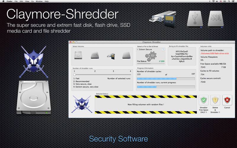 The Claymore-Shredder is the most effective hard-disk, flash drive, media card, SSD* and single file shredder software, available on the Mac App store ! 100 % Security !! NO DATA RECOVERABLE !!!