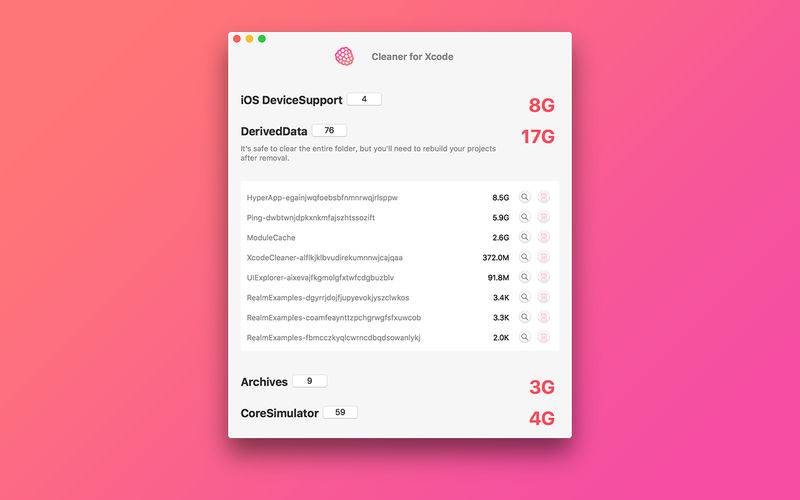 Cleaner for Xcode 可以检测您的 Xcode 占用磁盘的情况,统计各个部件所占用的空间。并帮助您清理版本升级过程中遗留下的文件,以及编译过程中产生的中间文件。