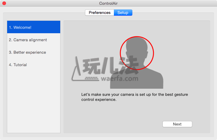 使用这款软件前你需要调整自己的坐姿,最好是将上半身做正,将你的大脸尽量保持在红圈范围内,这样可确保 ControlAir 快速找到你的手指位置,注意,初次使用 ControlAir,需要你手动播放一只歌曲: