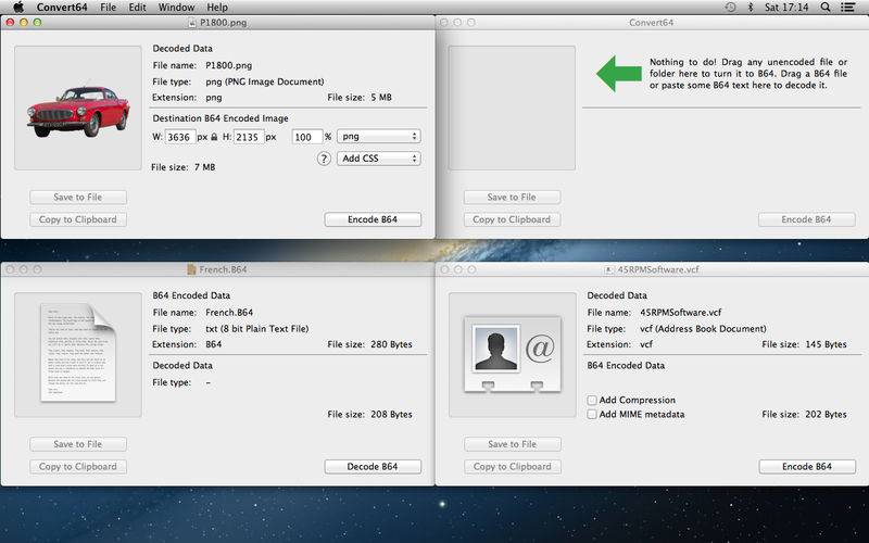 Please Note! File identification and image manipulation functionality is only available in Mac OS X 10.7 or newer. If you are using Mac OS X 10.6 (Snow Leopard) then Convert64 will function as a basic base64 file encoder / decoder only.