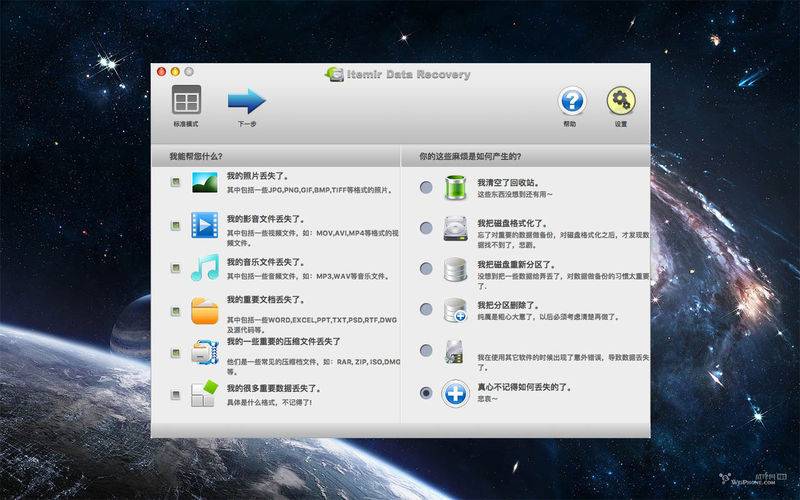 Cool Data Recovery是一个专业的数据恢复软件,它只需要你提供丢失数据的Mac磁盘镜像文件、外接磁盘镜像文件、SD卡或USB驱动器的镜像文件,就可以极大限度地恢复由于删除,格式化,重新分区,丢失分区,病毒感染,软件崩溃,意外断电或其他不明原因丢失的文件。