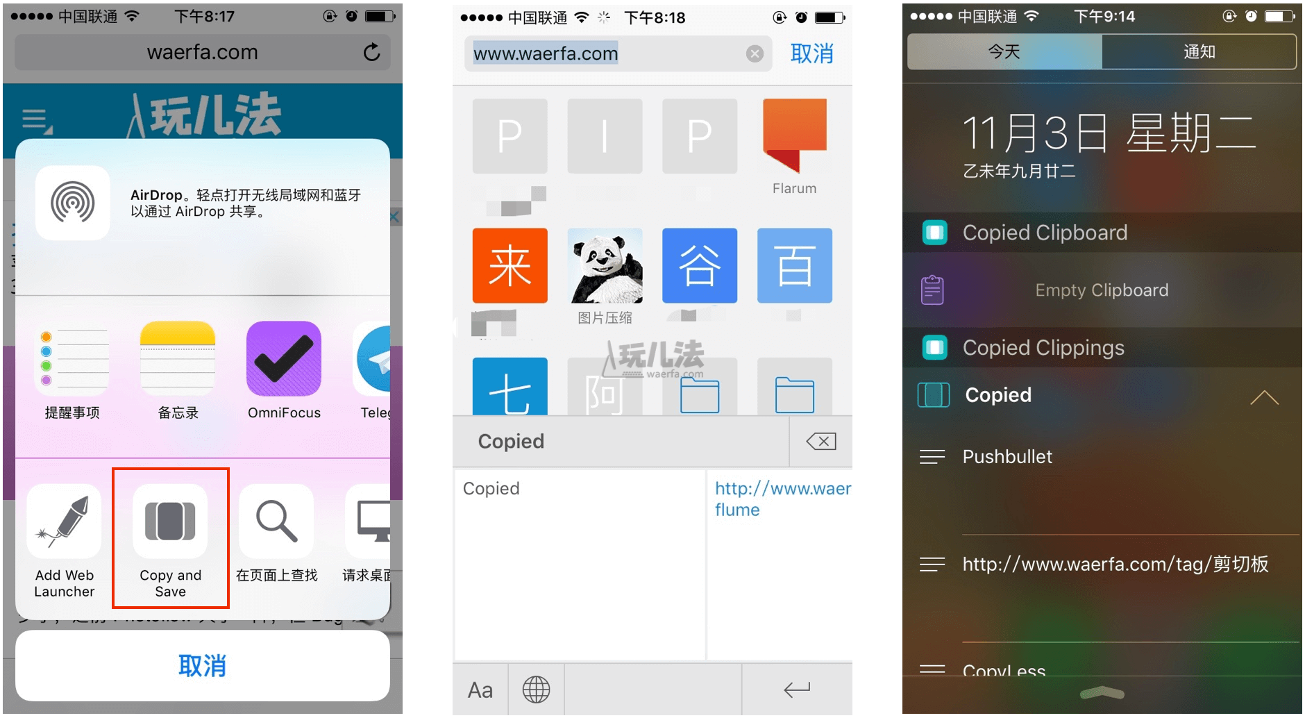 iOS 版能够释放的操作非常多样化,你可以通过 Safari 的 Extension Action 获取内容,同时也能使用 Copied Keyboard 来快速应用 Clipboard 文本/超链内容,甚至是在 Today Widget 上获取。
