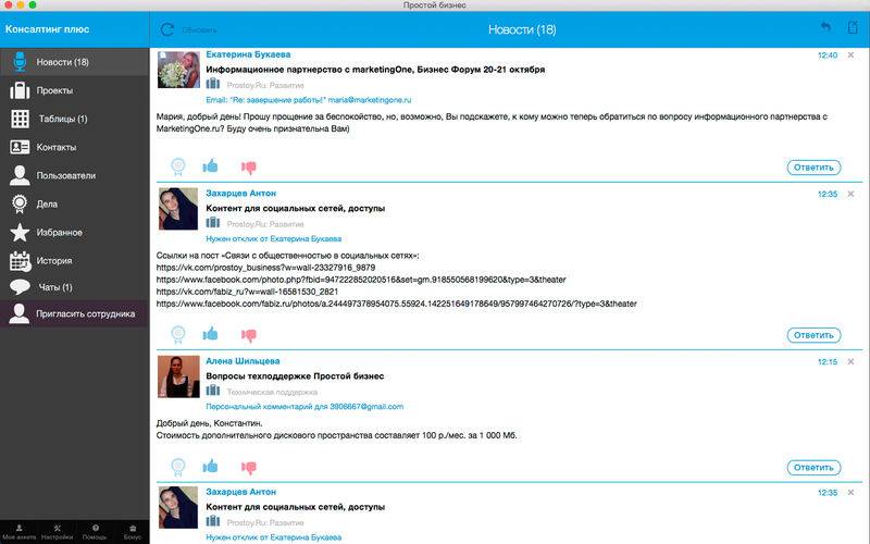 CRM-система «Простой бизнес» – больше, чем просто CRM, одна программа для управления всей Вашей компанией. В системе можно вести клиентскую базу, работать над проектами и задачами, общаться с клиентами по встроенной почте, а с сотрудниками – в чате, обмениваться файлами, ставить напоминания и многое другое. Система не ограничена по количеству пользователей, может работать без Интернета и осваивается за 15 минут.
