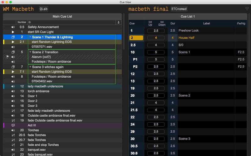 Cue View is a tool for remotely monitoring QLab and EOS control devices.
