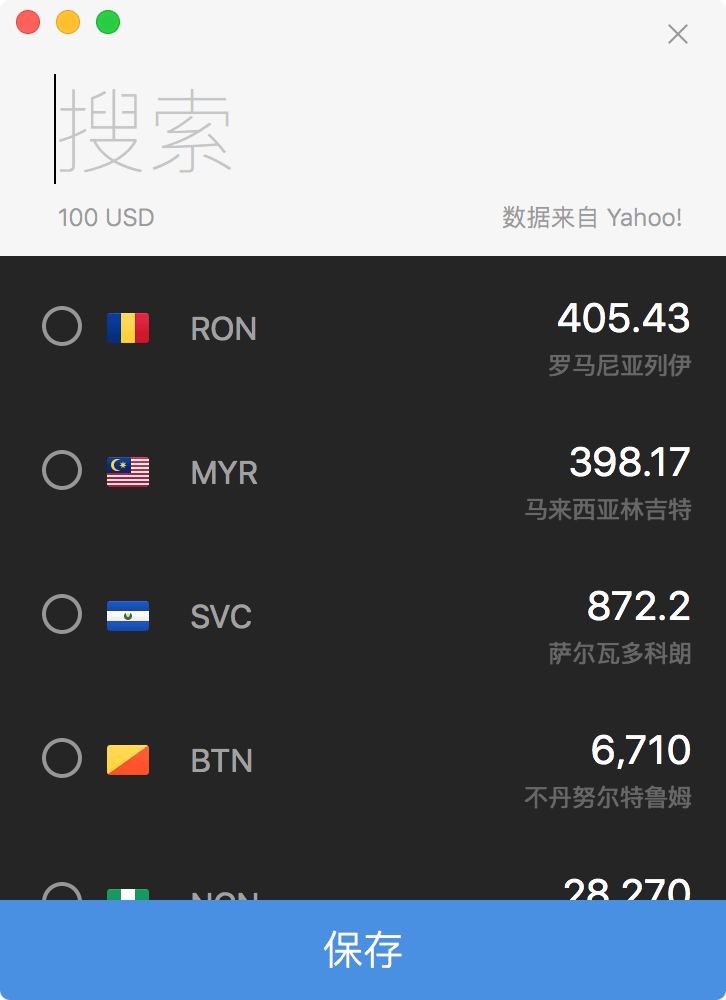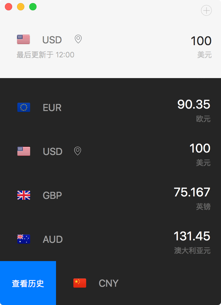 如果换算货币列表里没有你想要的货币,可以在窗口右上角点击加号添加你想要换算的货币,软件支持 160 个国家的货币换算,基本上无死角实现全覆盖。