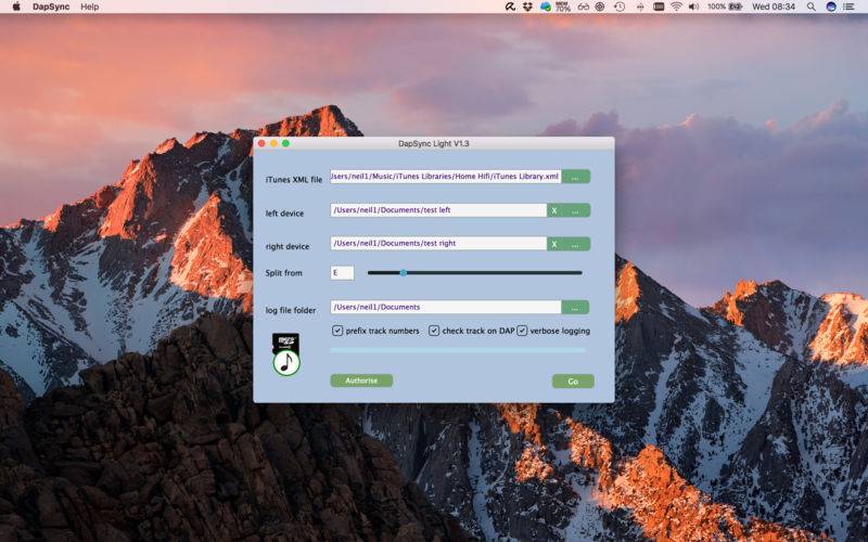 DapSync is a simple utility that synchronises your iTunes library with a DAP (digital audio player) or an SD card for the DAP. DapSync supports up to two storage devices and can prefix track filenames with track numbers for DAPs that do not sort on metadata. DapSync saves files on your DAP in a folder hierarchy based on artist and album name.