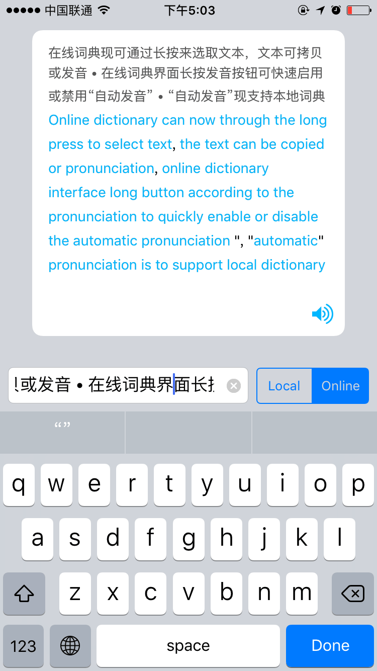 - Dictionary 提供在线词典和本地词典两种查询方式,对于小众些的单词都能覆盖到;