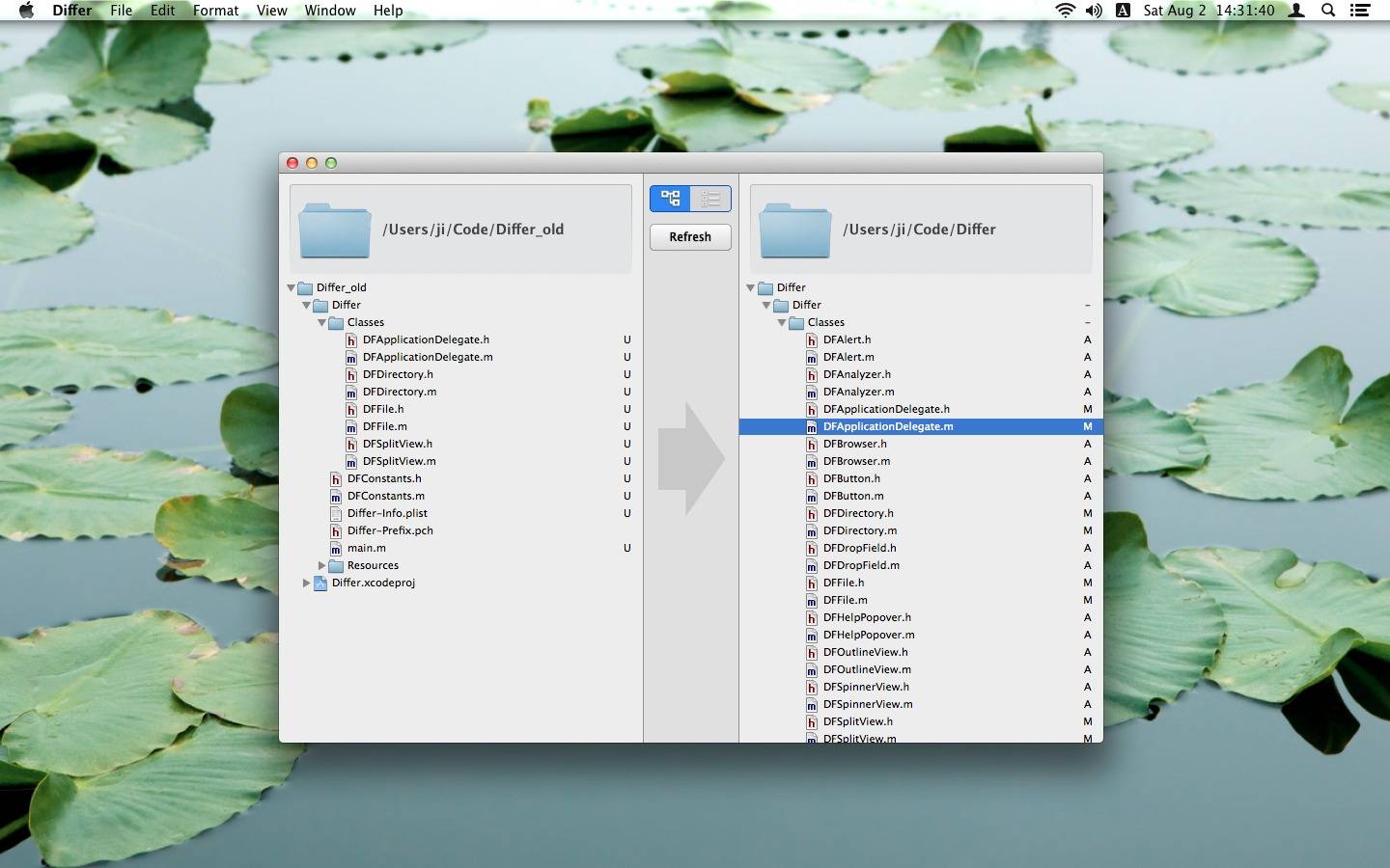 Differ lets you compare the contents of two directories simply and visually. This is especially helpful in using Xcode; you will often need to compare your current project with the previous version when testing or narrowing down the cause of a bug. The difference between two revisions can be created by command line, but this is not a useful way to compare projects. Differ simply presents comparison result of two directories by drag-and-dropping. It allows you to compare projects without a version control system. And you can open files in FileMerge by double-clicking.