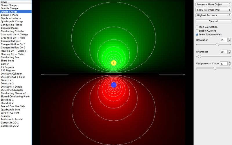 Demonstrates electrostatics and static current distributions in two dimensions. View the electric field of charges and conductors. Save an experiment and reload it later.