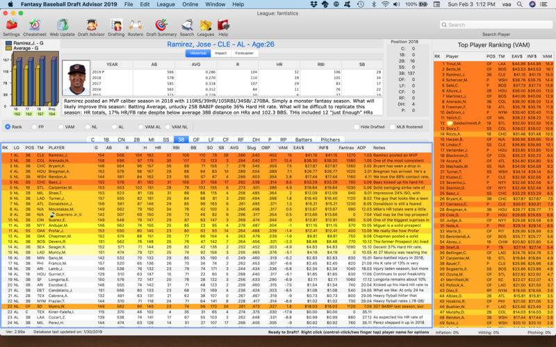 Bring our winning fantasy baseball advisory to your draft. Our player rankings adjust as players are selected, adhering to the changing dynamics of your draft. After a player is selected/drafted, the software will display/suggest the best players based on a proven position scarcity regression model. Over the past 20 years, we have correctly forecast the statistical direction on over 7 out of 10 professional baseball players for their upcoming season.