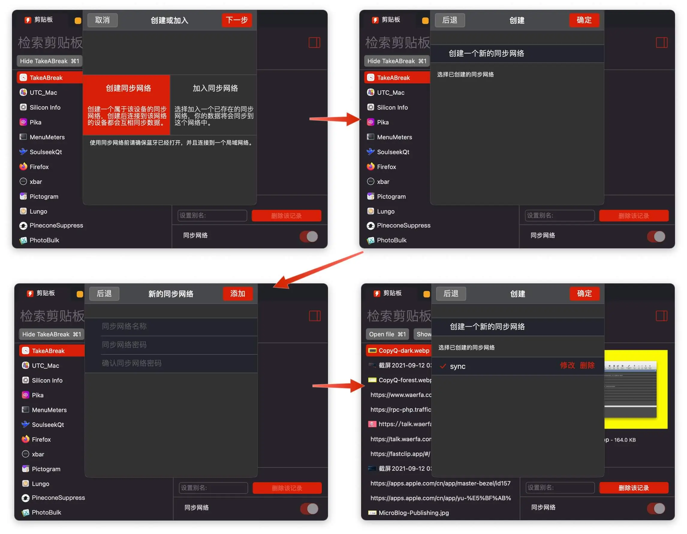 最后来说一下同步功能,可以让你的剪贴板数据在 macOS 与 iOS 快速同步,同步机制基于密码认证和蓝牙技术完成,我们在 Mac 端创建一个同步网络,然后在 iOS 端加入已有网络,并输入对应网络的密码即可,这里的过程我同样遇到了报错,不过还是加入成功了。