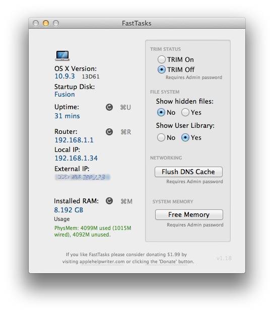 FastTasks is a free utility that provides a GUI interface for common Terminal tasks including: Check status, enable and disable TRIM for SSD Show/Hide hidden files, and/or the user library Show your internal and external IP addresses Flush DNS cache Free memory and more.