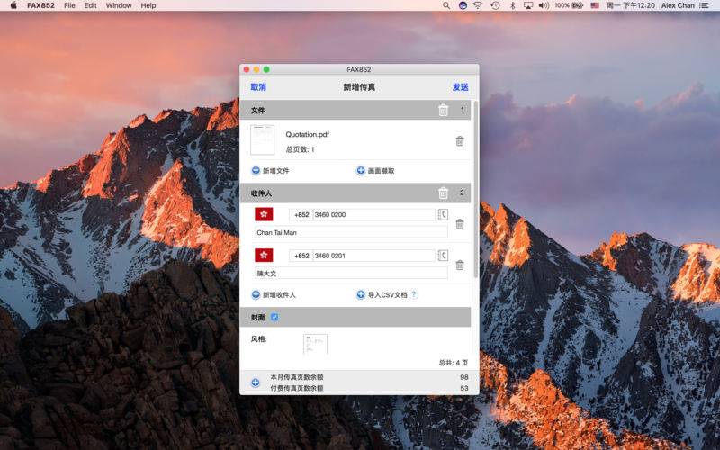 FAX852将您的Mac变成一个传真机。您可以随时随地的发送传真。透过FAX852,您可以发送传真到任何一个香港的传真号码。