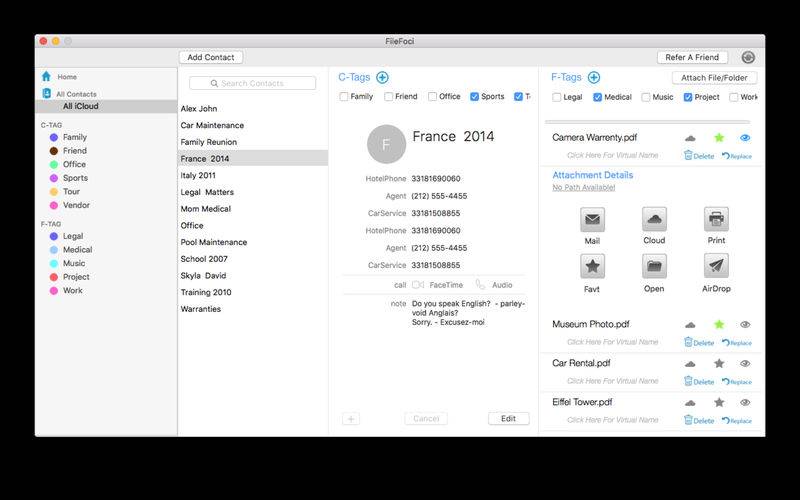 FileFoci is a most unique app. It lets you link your files and folders to a customized contact, which you can set as a project, tour, event, idea name etc. whatever you can dream up. You may have saved your files on several different devices or computers, FileFoci will help you see all such files or folders (including directory paths) under one name, without moving them anywhere. Once you use FileFoci, you will wonder how you functioned without It.