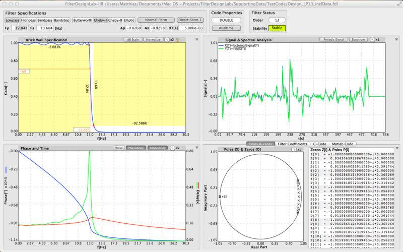 FilterDesignLab-IIR is a design and simulation environment for digital Infinite Impulse Response (IIR) filters. It is structured into four views for designing the gain, analyzing the phase, simulating test signals, and generating code and filter coefficients.