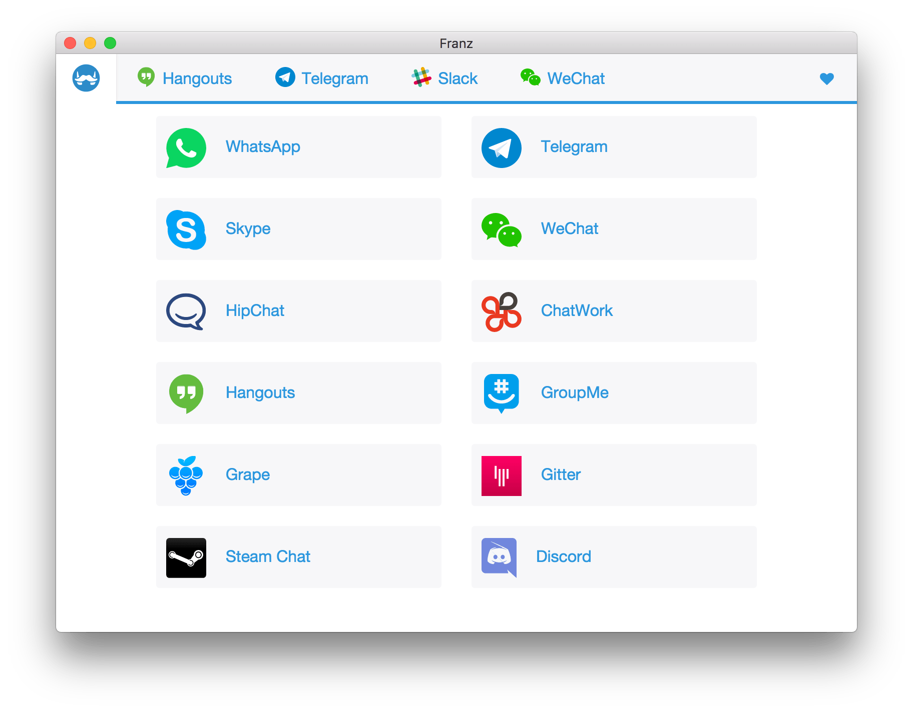 Franz 是一款集成各种流行社交服务的客户端软件,支持在应用内同时登录 Slack, WhatsApp, Facebook Messenger, Telegram, Google Hangouts, Skype 等社交网络,最近的版本里还加入了对天朝微信的支持。