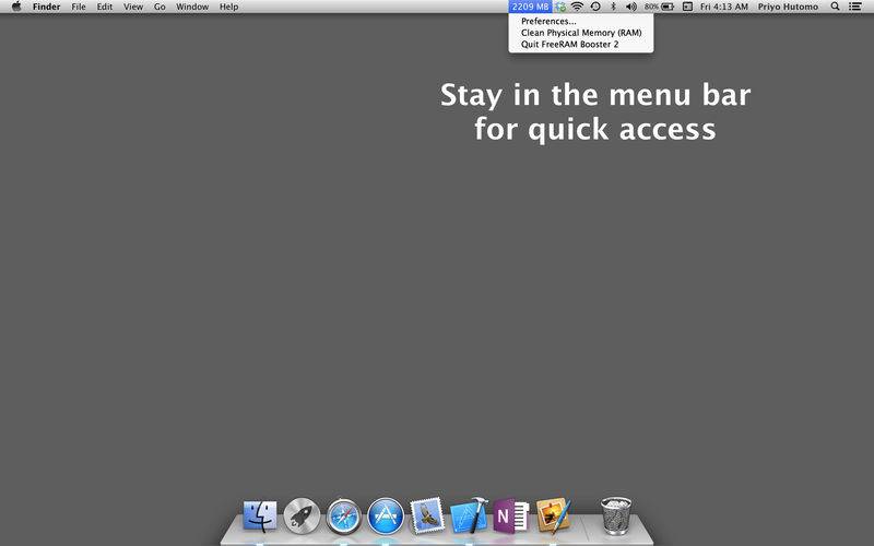 FreeRAM Booster is a smart memory management program that will keep your Mac OS X Lion from running slower and slower after been used for several hours. FreeRAM Booster works by freeing up unused physical memory allocated by system and other applications thus more RAM can be allocated to current tasks.