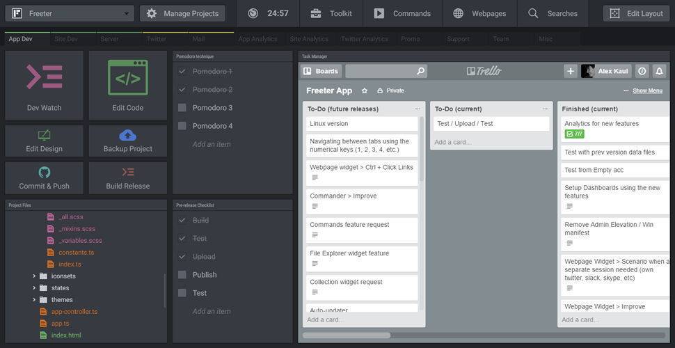 Freeter was created for those who works on computer and have to do lots of repetitive actions, such as launch editing tools, open project files, navigate to a task manager and so on. Freeter enables you to turn the messy workflow into a streamlined process, saving you time and effort. It collects all things you need to work on your projects in one place and makes them highly accessible. Accessing all your project-related things becomes as easy as pushing Cmd+Shift+F. Note: Free edition supports 3 projects, 5 dashboards per project, and standard icons in the appearance settings. If you need unlimited projects and dashboards, and want customizable icons, then you should buy Pro.