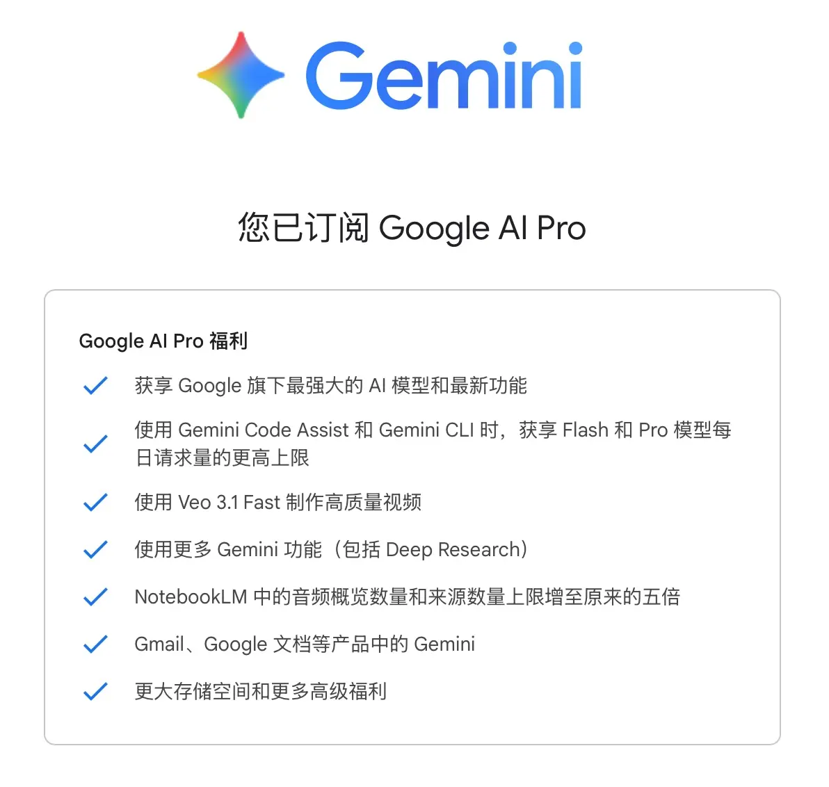 Google AI 分为 Pro 和 Ultra 两个版本,看了看价格 Pro 入个门,月租 $19.99,首月免费,如果你是学生还有更合适的首年免费方案。AI Pro 是一个集合式样的包装产品,购买她主要就是为了使用 Gemini 以及每周都会更新的最新 AI 模型,在免费版基础上突破有限的 tokens,可以使用 Flash 和 Pro 模型更高上限的 tokens,解锁 Veo 3.1,Deep Research,还有 15GB 的云空间容量!