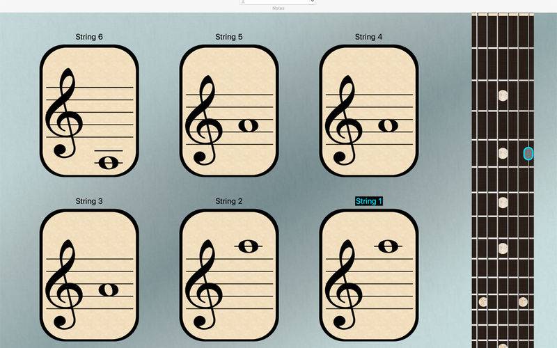 There will be 6 cards shown on the screen, one for each string, with the note represented on the staff for that note.